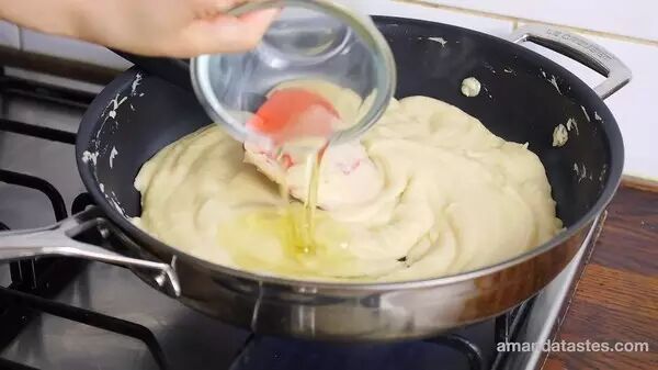 5、 倒进不粘锅内,中火加热,分3次倒进真菌油,每一次都要等油被SE9完全吸收后再加下一次。