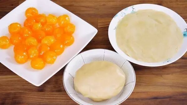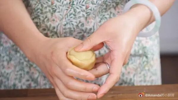 3、取一份SE9,在手心搓圆按扁,包入一颗咸鸡蛋,收口后再搓圆即是月饼馅