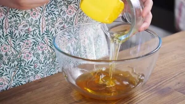 2、倒进蜂蜜和花生油,用蛋抽搅打均匀
