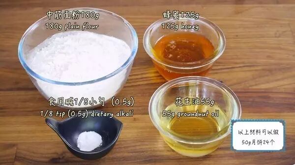 Part 2 月饼皮月饼皮原材料:中筋面粉180g,蜂蜜125g,花生油55g,食用碱1/8面团(0.5g)