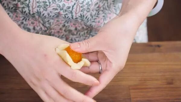 3、用月饼皮包住馅时要留神操作,收口处要仔细检查和