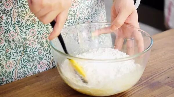 3、倒进面粉,用刮刀拌成面团