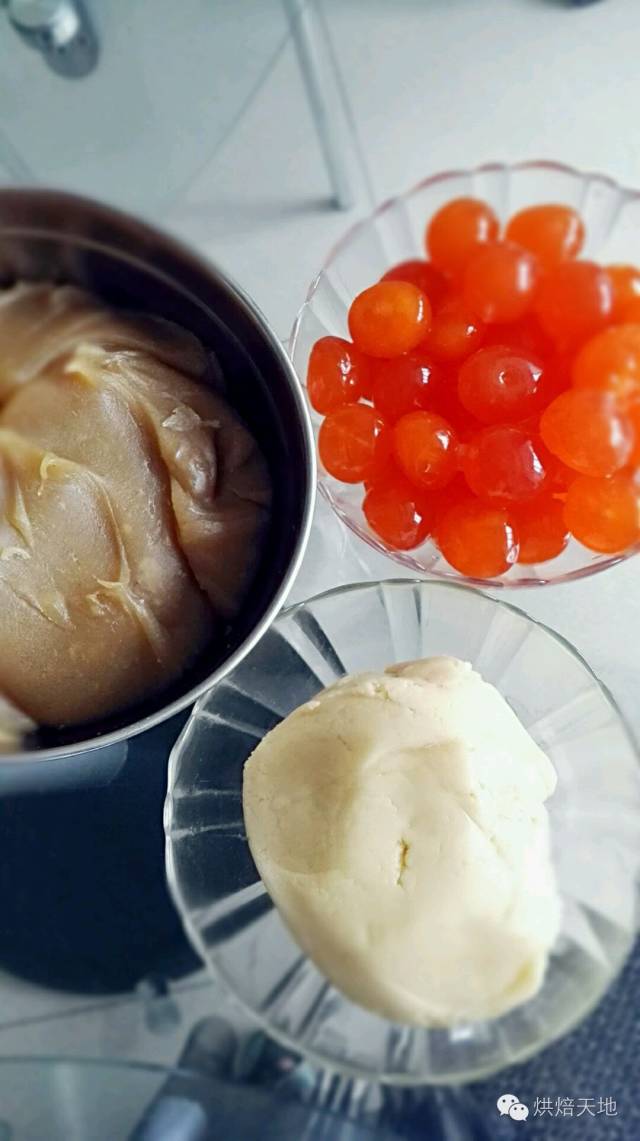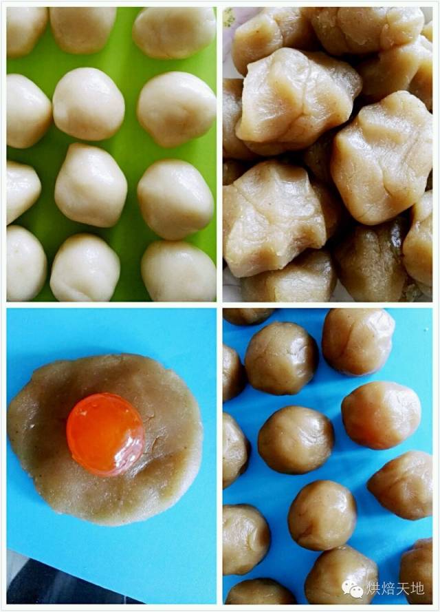 4. 皮面糊分为20g两个的小剂,五仁分为60g两个的泡果。五仁小剂挖空,拌成咸鸡蛋,揉圆。