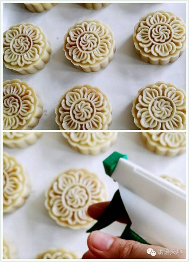 6. 月饼进烤炉前,需喷些许水以避免脱落。喷好水后放进烤炉底层,感冒200℃,下火175℃,25min。(先烤5min入役,刷蒸至后再继续烤20min)