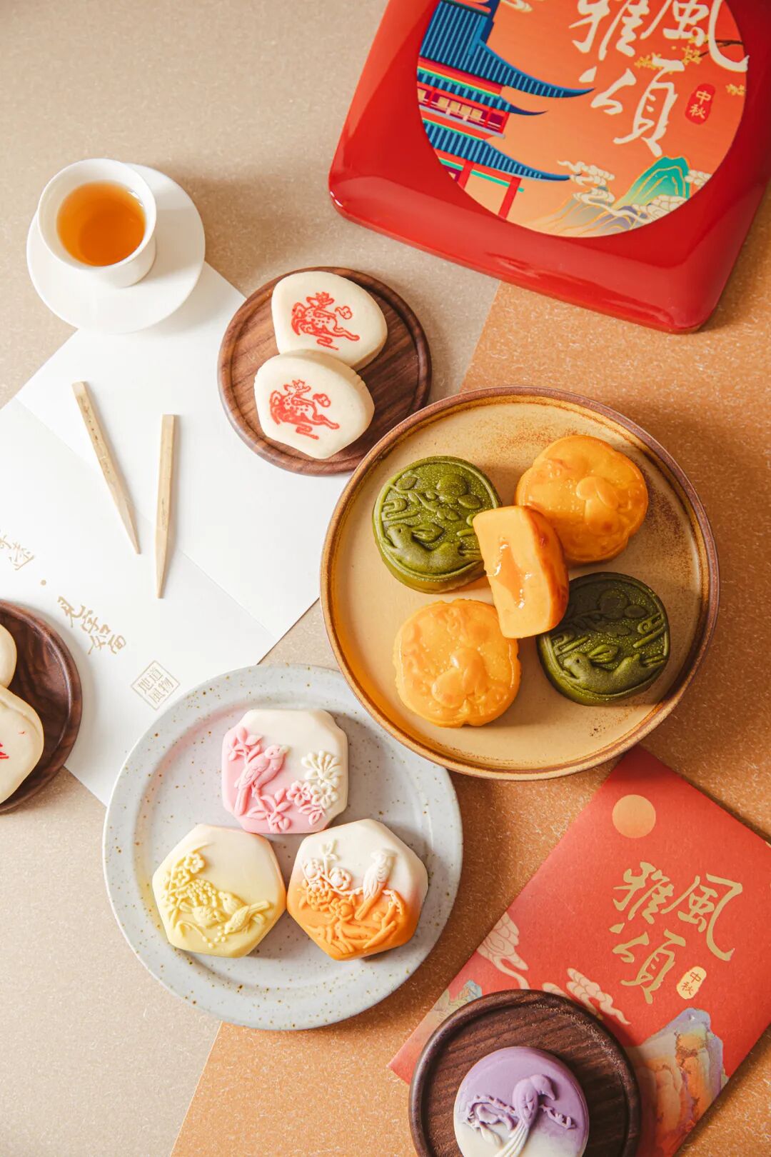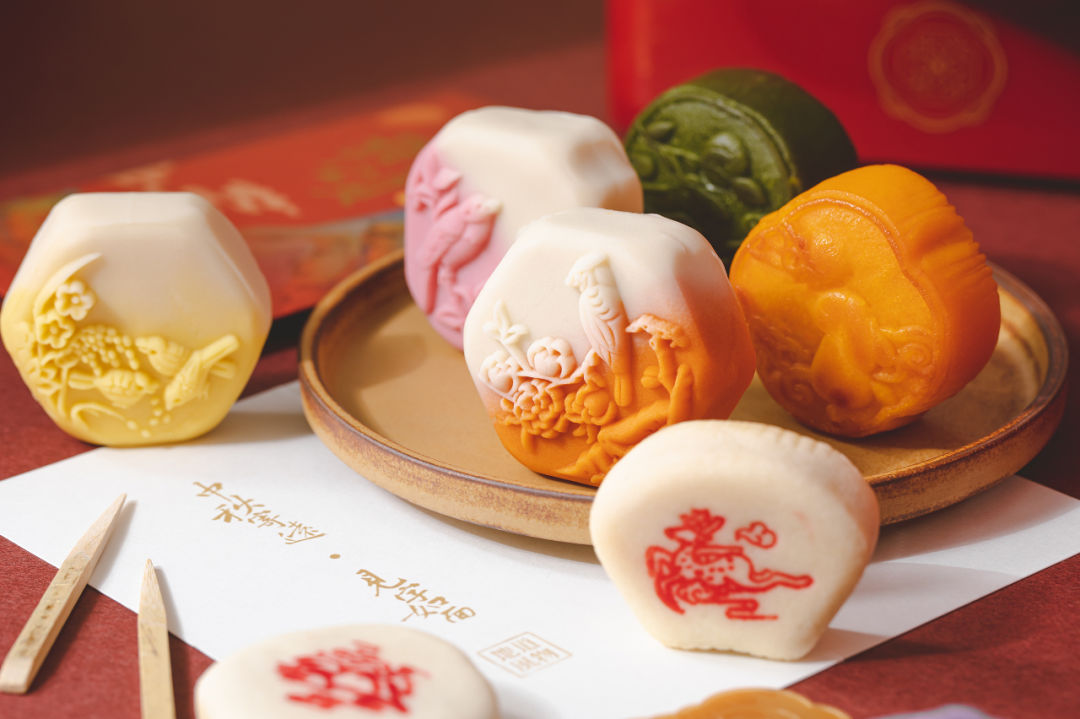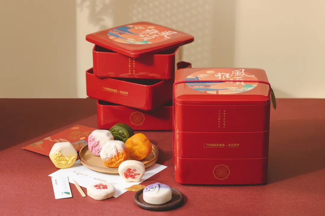 菓子的外型选取的是苏州园林中的经典窗棱外型,表皮是喜鹊花纹,寓意中秋团聚、美满。搭配独特的渐变色饼皮,恍惚之间,仿若穿越。